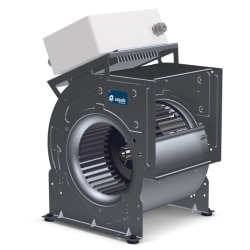 Ventilador centrífugo de doble aspiración con motor brushless de imanes permanentes, especialmente eficiente y silencioso. Su diseño incorpora turbinas de poliamida reforzada o chapa galvanizada según modelo, y un sistema exclusivo de fijación que reduce vibraciones. Ideal para integración en sistemas de tratamiento de aire, campanas industriales y aerotermos. Admite control de velocidad mediante señal 0-10V o PWM, soporta temperaturas de hasta 50 °C y cuenta con protección IP54/IP65.