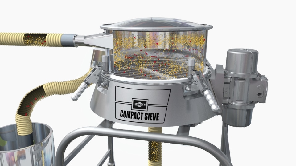 Nuestro tamiz de transporte por vacío Russell Compact Airswept Sieve™ combina el tamizado de seguridad y el transporte neumático en una sola operación, moviendo el material desde el almacenamiento hasta la siguiente fase del proceso.